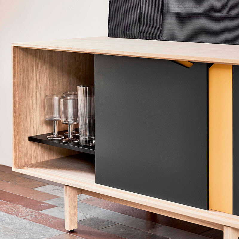 De vendbare låger er designet uden hængsler eller håndtag og glider let i præcist fræsede spor. Den ene side af lågerne er beklædt med sort laminat, mens den anden side fås i forskellige laminatfarver, så du nemt kan ændre udtrykket.