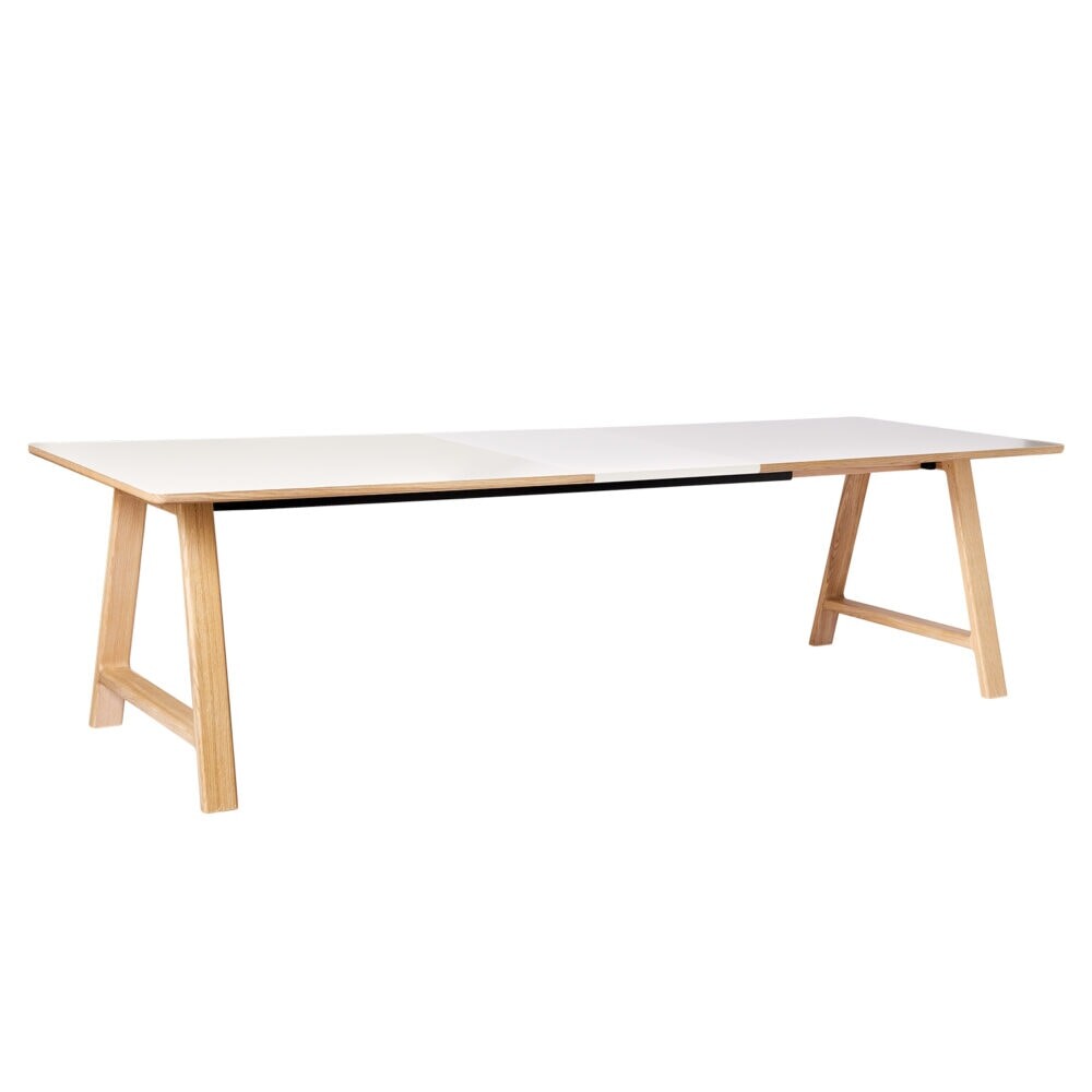 T11 har en standardstørrelse på 220 x 95 x H74 cm, men kan nemt udvides med op til fire tillægsplader. Hver plade måler 50 x 95 cm og fås i enten hvidmalet eller hvid laminat med egekantliste. Bordet inkluderer et støtteben, som anbefales ved brug af tillægsplader for ekstra stabilitet.