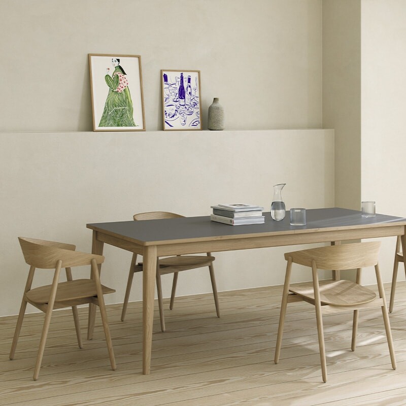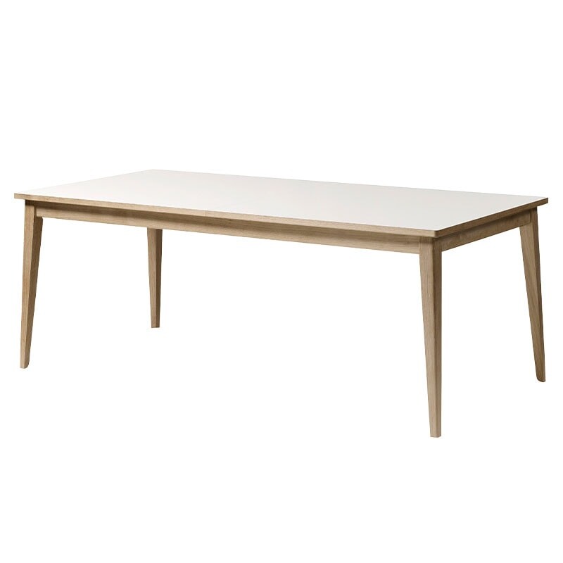 T3 har en bordplade i hvidt laminat kombineret med et understel i massiv eg. Tillægspladen fås i flere farver i enten laminat eller Fenix laminat, hvilket giver mulighed for at tilpasse bordet efter individuelle præferencer.