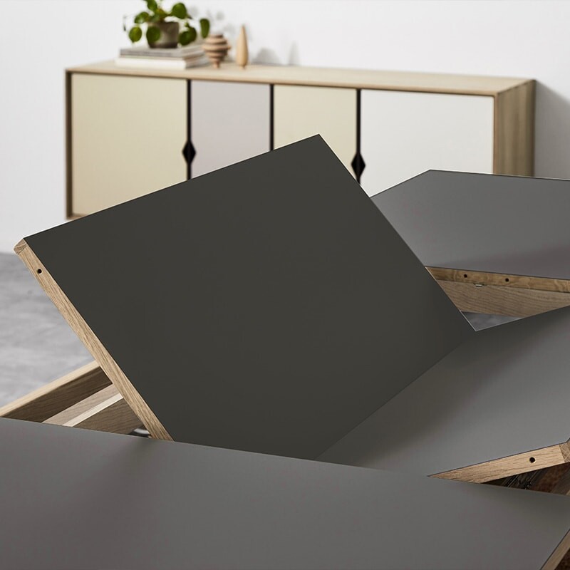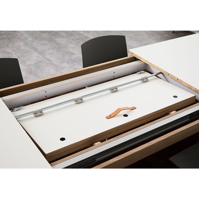 Den todelte tillægsplade er fast monteret under bordet og foldes nemt ud ved hjælp af en integreret læderstrop. Denne butterfly-løsning sikrer, at tillægspladen beskyttes mod ridser, samtidig med at der ikke er behov for separat opbevaring.