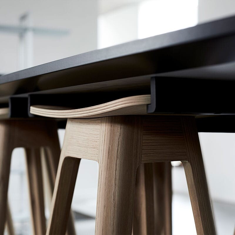 For optimal komfort kan du vælge mellem et træsæde eller en variant med polstret sæde i sort PU-læder. En særlig funktion ved stolen er dens smarte ophængsmulighed på højborde, hvilket gør den ideel til både private og professionelle miljøer.