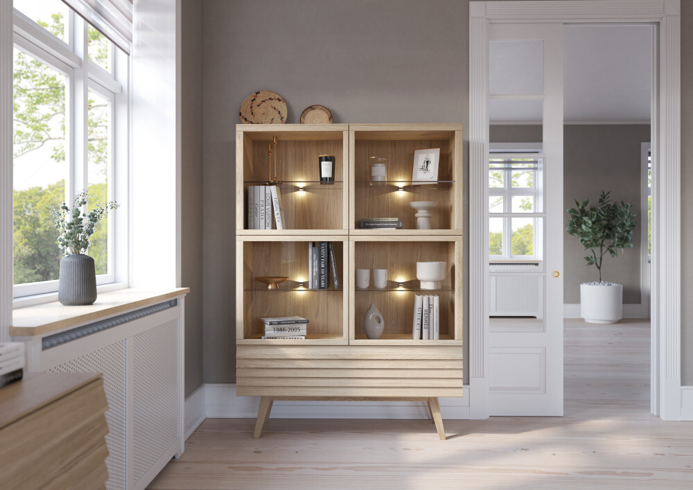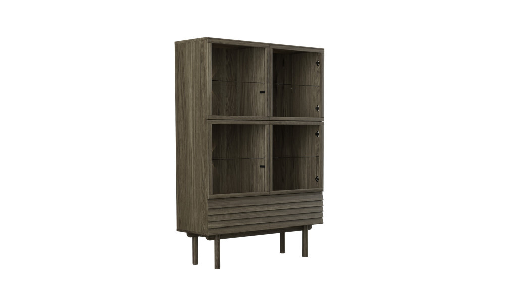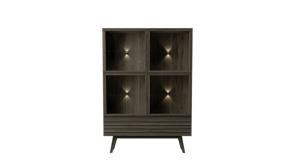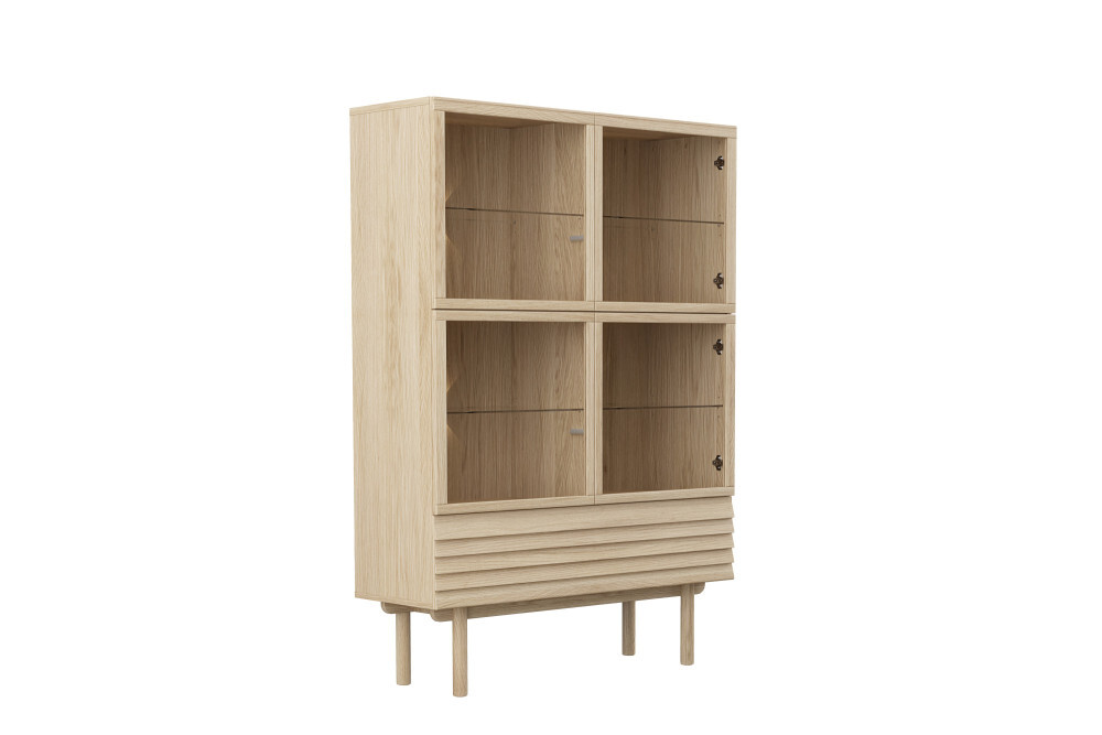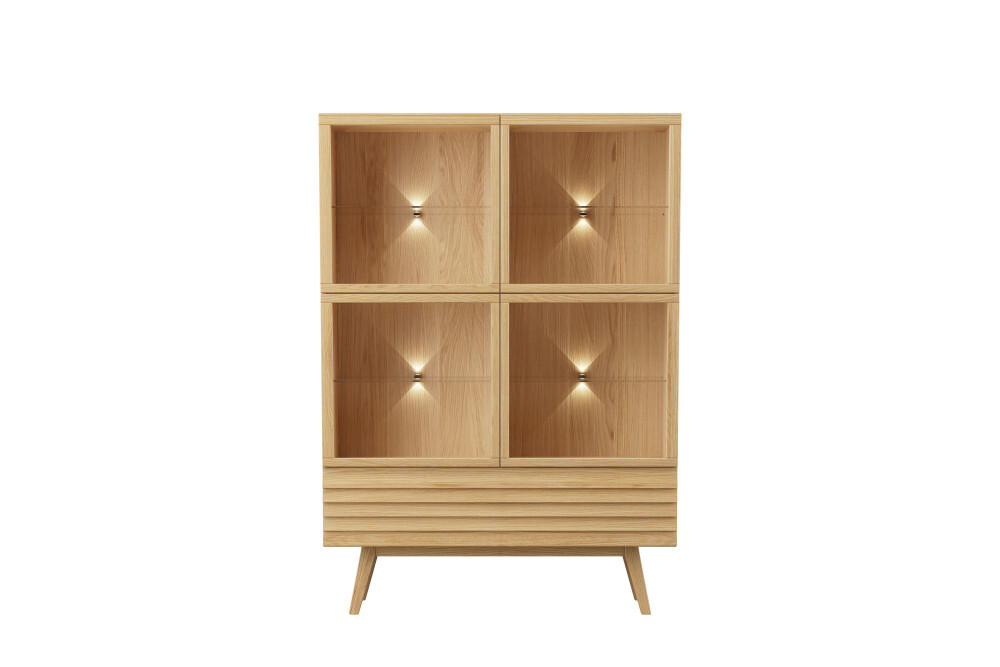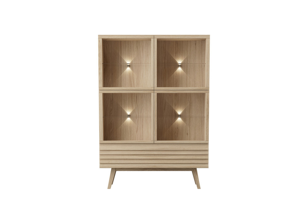 Highboardet er udstyret med fire store glaslåger med rammer i massivt egetræ. Bag hver låge findes en flytbar glashylde, der kan monteres med lys – lys er inkluderet. Under glaslågerne er en praktisk skuffe med indvendig opdeling, der sikrer optimal opbevaring.
