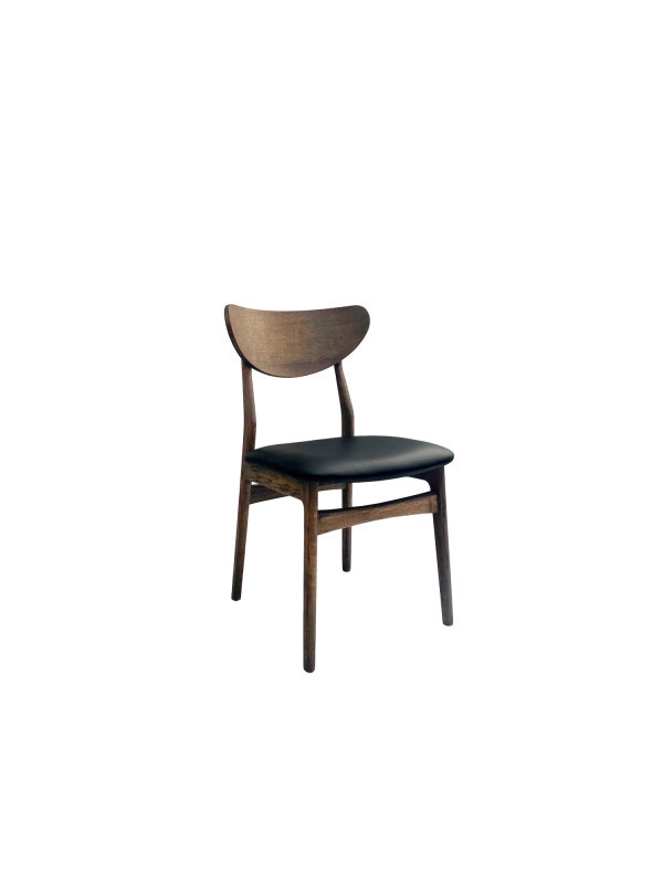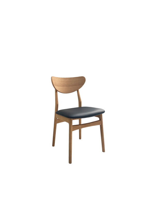 Stolen er fremstillet i egetræ og har et sæde i sort læder. Træet er behandlet med enten olie eller sortbejdse, hvilket fremhæver de naturlige egenskaber, sikrer god holdbarhed og gør stolen let at vedligeholde.
