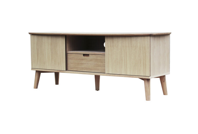 TV-bordet har to skydelåger, hver med en justerbar træhylde bag sig. I midten af møblet er et åbent rum, der måler 48x16,5 cm, og som også har et praktisk hul til kabeludtræk. Under det åbne rum finder du en smart skuffe med soft-close funktion.