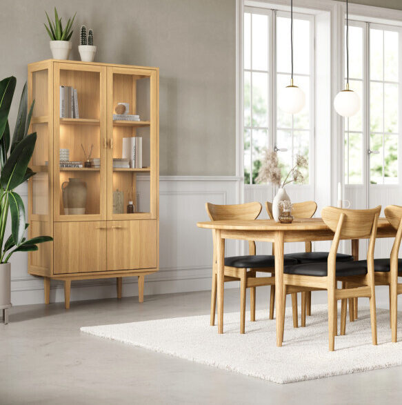 Vitrinen er designet med fire låger – to i træ med soft-close funktion og to i glas. Bag glaslågerne findes to faste træhylder med indbygget belysning, der skaber en flot præsentation af dine yndlingsting. De to trælåger skjuler et åbent opbevaringsrum med en justerbar træhylde. Glas i siderne bidrager til et let og luftigt udtryk og sikrer optimal fremvisning af skabets indhold.