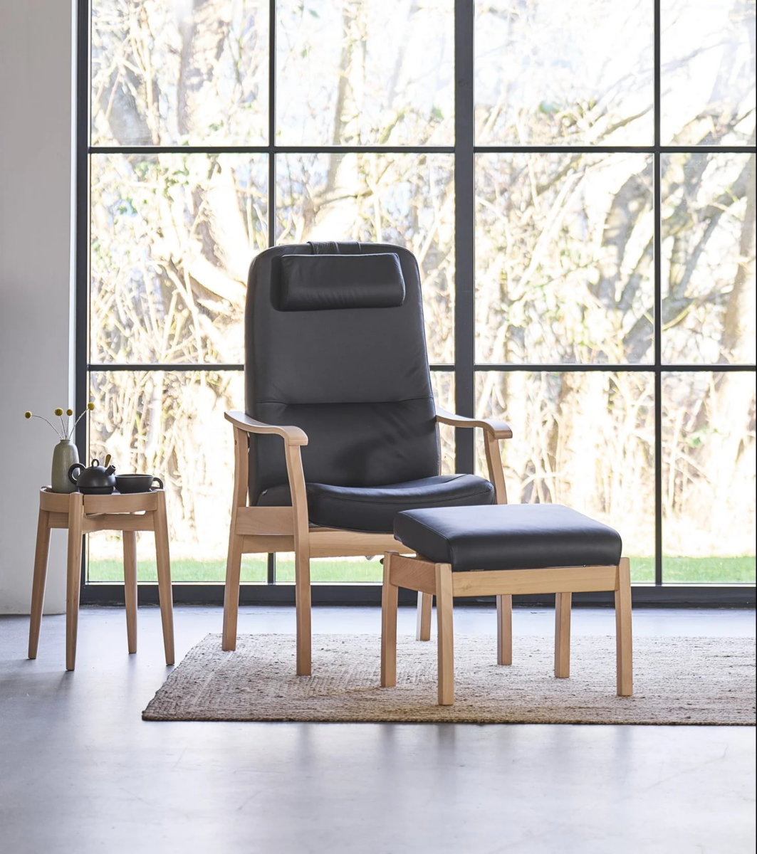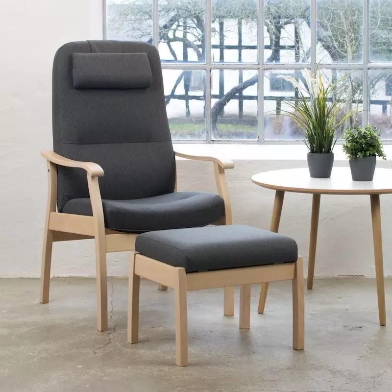 5610 Applaus er bygget på et stel af massiv bøgetræ og tilbyder en række valgmuligheder, når det kommer til behandling af træet. Du kan vælge at lade træet stå ubehandlet, vælge en hvidoliering eller flere forskellige bejdsebehandlinger. Stolen kan fås i fem forskellige farver af smukke kvalitetstekstiler fra Gabriel. For at skabe den ultimative hvilestol med den bedste siddeoplevelse, er 5610 Applaus udstyret med en behagelig nakkepude og en trinløst justerbar ryg, som giver mulighed for at finde den perfekte hvileposition. Nakkepuden kan nemt justeres i højden for optimal støtte.