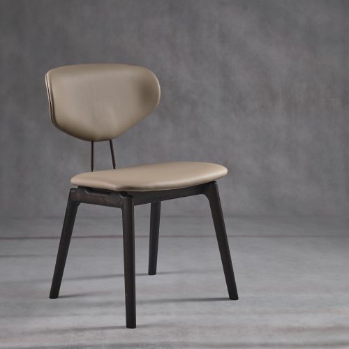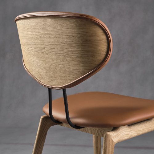 Høj siddekomfort med polstret sæde og ryg. En metaltråd på bagsiden giver stolen en behagelig fleks. Metaltråden kan vælges i enten rosaguld eller sort. Smukt fineret på bagsiden. Siddehøjde: 48 cm.