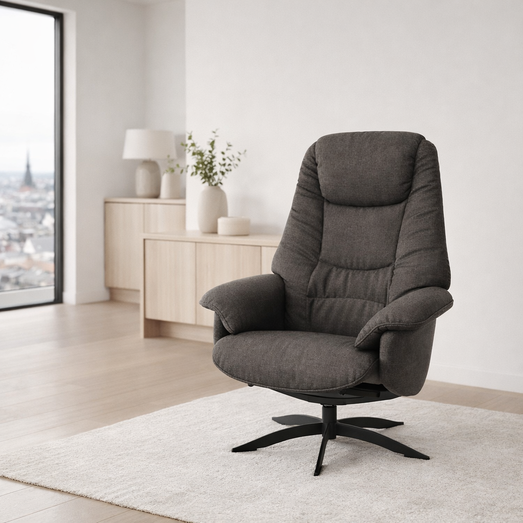 Drejestol med dejlig komfort. Ryggen kan lænes tilbage, så man opnår forskellige siddepositioner til gavn for ryggen og bekvemmeligheden. Fås i mange stof- og lædervarianter.