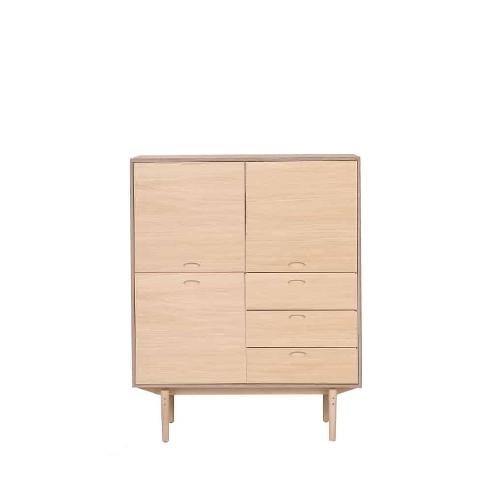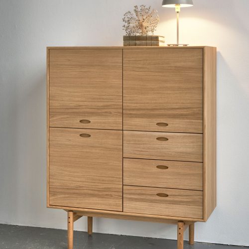 Et skab med fronter og låger i træ, udført med smukt afrundede massive kanter og elegante gering-samlinger. Highboardet er indrettet med 3 skuffer og 3 låger.