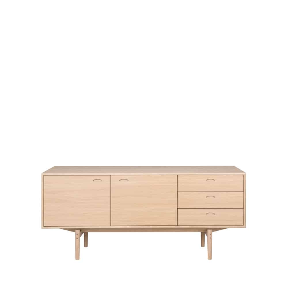 Et skab med fronter og låger i træ, udført med smukt afrundede massive kanter og elegante gering-samlinger. Skænken er indrettet med 3 skuffer og 2 låger.