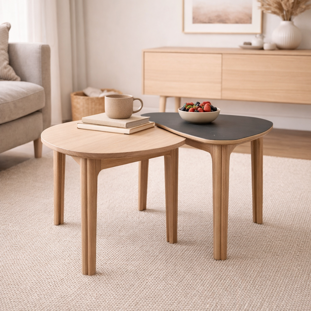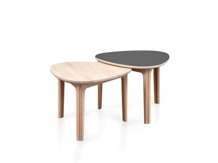 Sofabordet #207 har ben som danner en trekant, og en bordplade med en spændende afrundet trekantform. Sofabordet findes i 2 højder, se #206, og det lave bord kan således skydes lidt ind under det andet.